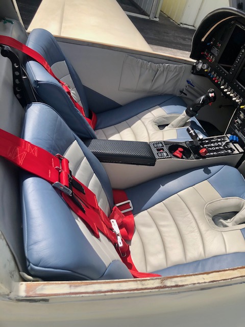 • Leather interior with memory foam seats, 4-point-seat belts, pockets for maps, pens, lights. Lancair logo embroiled on the rear bulkhead
