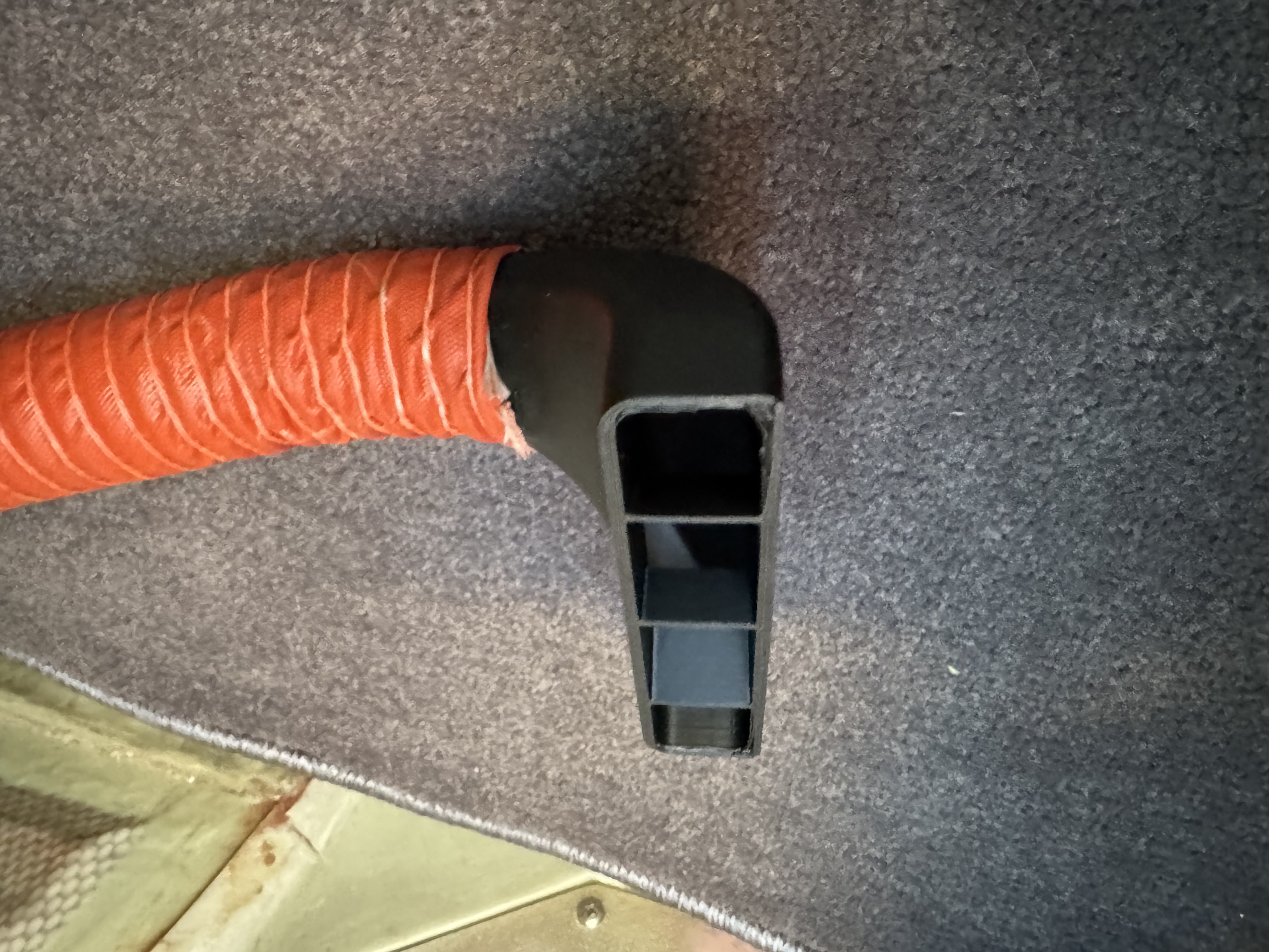 Jonathan, you could also consider an eyeball closing vent that works very well and is off-the-shelf and connects to the scat hose. Either 1.5 inches or 2 inches. The benefit is controllable flow and similar cost. Good luck and thanks for posting the part. Foot heat at altitude is one of the biggest problems in every aircraft I've owned. They were all fixed with Jonathan's idea of adding air ducting to the foot well.