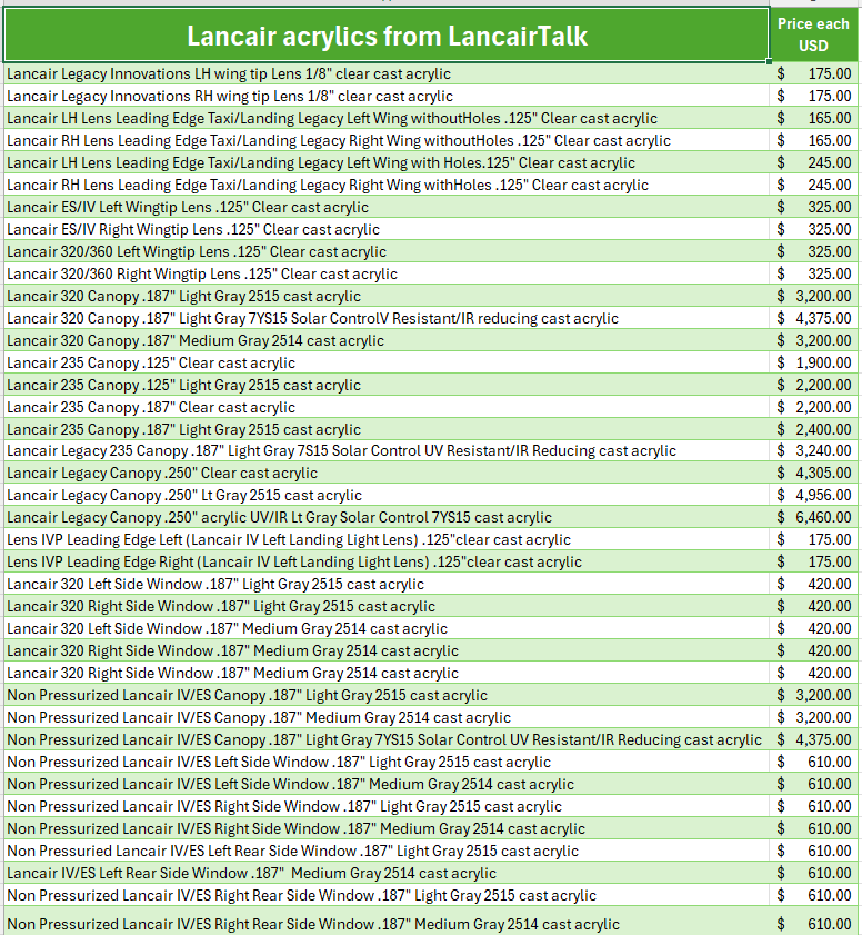 Parts and Services provided by LancairTalk for owners and shops. Purchases enable this website to operate. LT-WTS is the prefix. If you need to order send an email to sales@lancairtalk. if you have parts that you wish to be sold here send a note so we can add the item.
